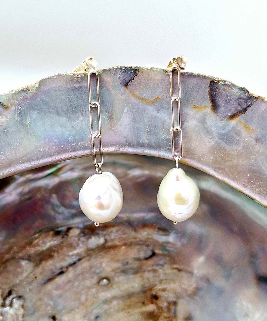 These statement earrings exude luxury and sophistication, featuring large, lustrous baroque pearls suspended from delicate sterling silver chains.