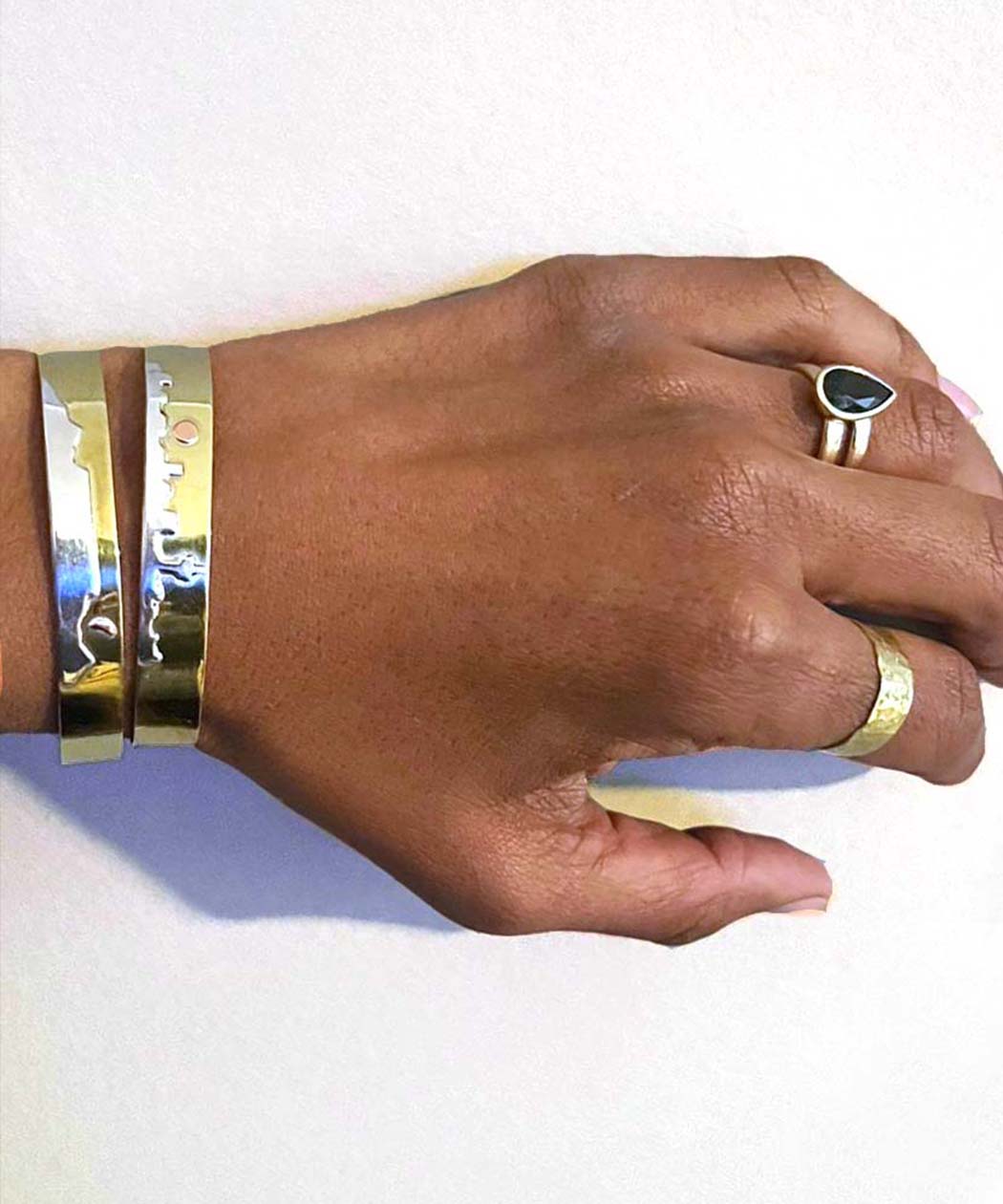 The Johannesburg and Cape Town skylines have been hand pierced in silver and copper and sit upon a brass bangle.